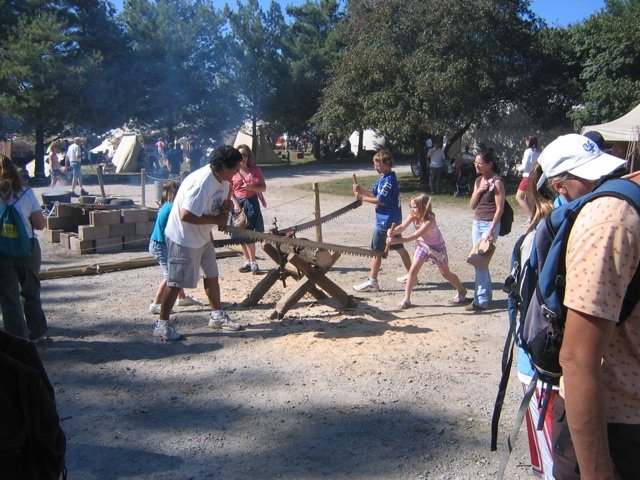 Shortly after entering the grounds, we stumbled on a performance of two jugglers. They were good jugglers, but the best part of their performance was the chatter that they kept going--they were very funny. We then wandered over to the performance area by the reconstructed blockhouse, which may or may not be like an original building of the fort. Here is a picture of it, complete with a line of people waiting to get to an ATM machine.