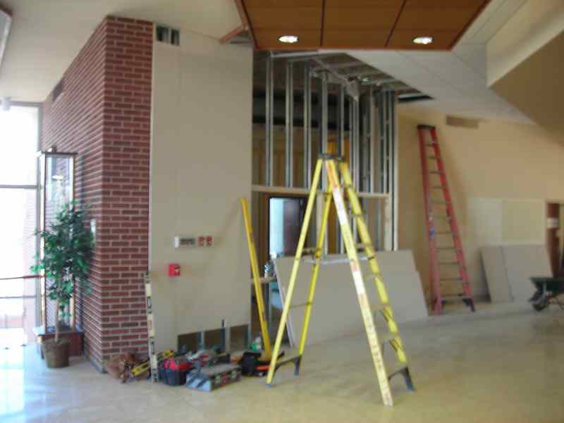 Update Thursday: When I stopped by today the workers seemed to be on lunch break. I walked along the south side of the building and found this sign amusing. If you look through the window you can see the pictures of the planets that are on the walls of the north wing.