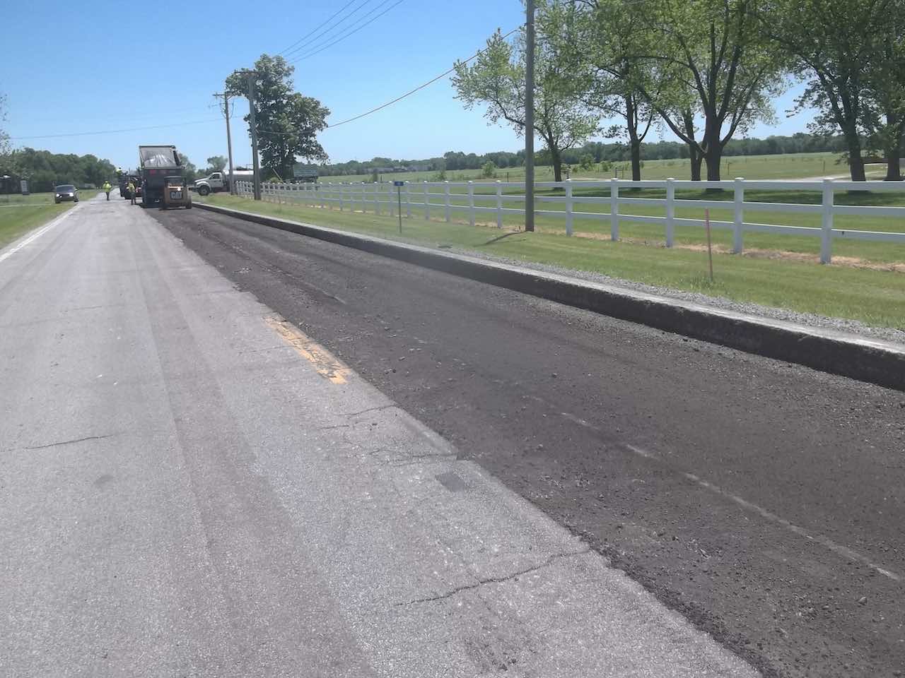 Notice that the sides of the road have been milled. The rest of the road from the Interstate will also be milled and then repaved. This section was milled early so the asphalt could be made level with the milled street and there would be no need to mill the newly laid asphalt.